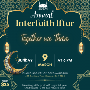 Join us for a special evening where you learn about Ramadan, connect with people from diverse faith backgrounds, and experience the joy of breaking the fast together over a delicious meal. For any questions, please contact interfaith@coronamuslims.com