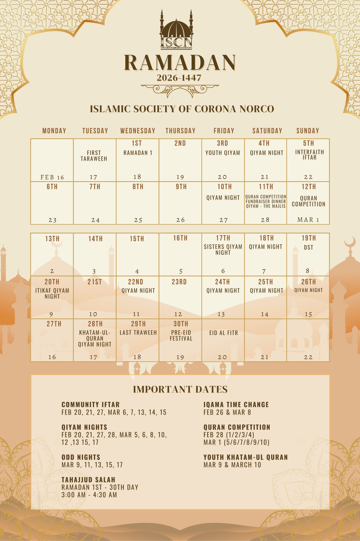 | March 13, 2026 | Friday | 11:30 PM | Qiyaam with MSA-West ↗ |